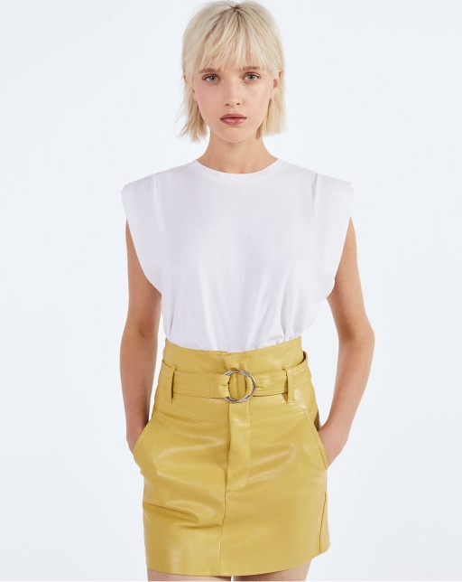 The insulated jacket is made of leather. A light layer of insulation. Details: stand-up collar, zipper, two pockets on the sides.